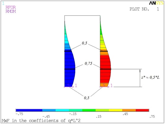 Координата z* вершины параболы на эпюрах внутренних изгибающих моментов указывается приблизительно, с точностью до размера одного конечного элемента, то есть с точностью +-L/20.