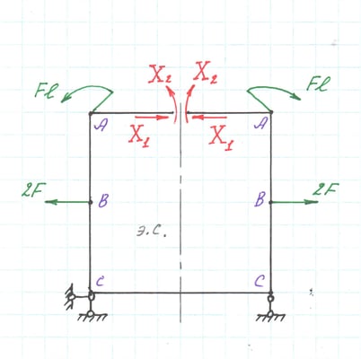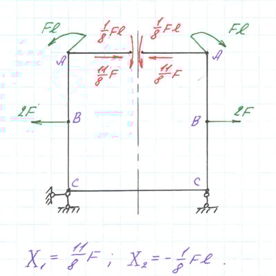 Эквивалентная система, значения реакций отброшенных внутренних связей X1 и X2 уже вычислены.