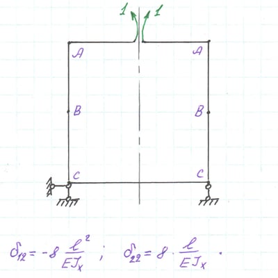Основная система с единичным моментом по направлению реакции X2, и коэффициенты δ12 и δ22 системы канонических уравнений.